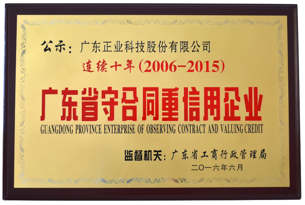 廣東正業(yè)科技股份有限公司連續(xù)十年(2006-2015)獲得“廣東省守合同重信用企業(yè)”榮譽(yù)稱號(hào),成為業(yè)內(nèi)值得信賴的良心企業(yè)。